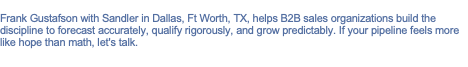 Frank Gustafson with Sandler in Dallas, Ft Worth, TX, helps B2B sales organizations build the discipline to forecast accurately, qualify rigorously, and grow predictably. If your pipeline feels more like hope than math, let's talk.