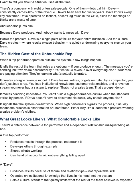 There's a company with eight or ten salespeople. One of them -- let's call him Dave -- consistently carries 40% of the revenue. Dave's been here for twelve years. Dave knows every key customer. Dave operates on instinct, doesn't log much in the CRM, skips the meetings he thinks are a waste of time.