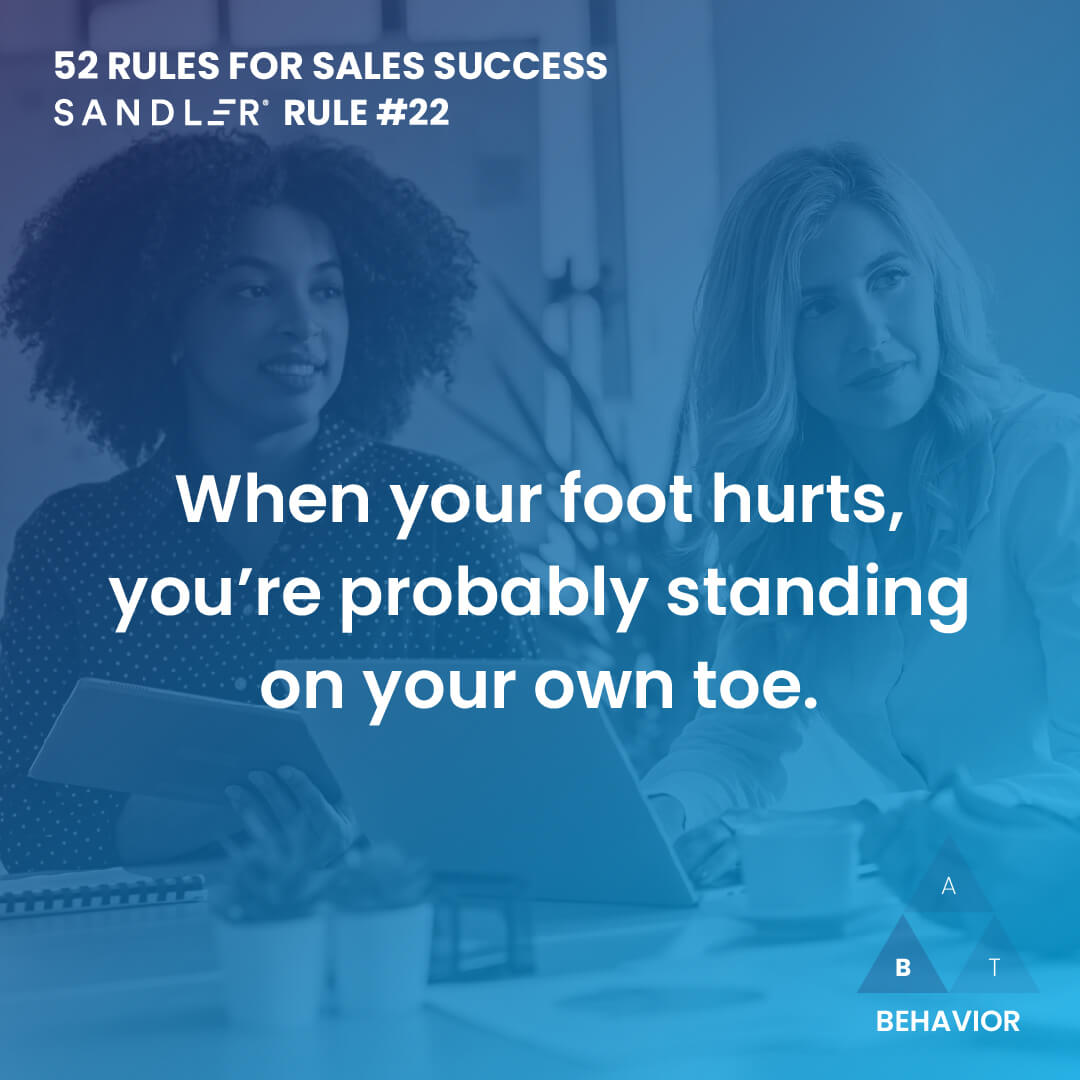 This rule is one of my favorites but is one of the hardest to identify and correct the behavior. This Sandler rule states that we should take responsibility when something goes wrong, and that we shouldn’t even think about blaming the prospect.